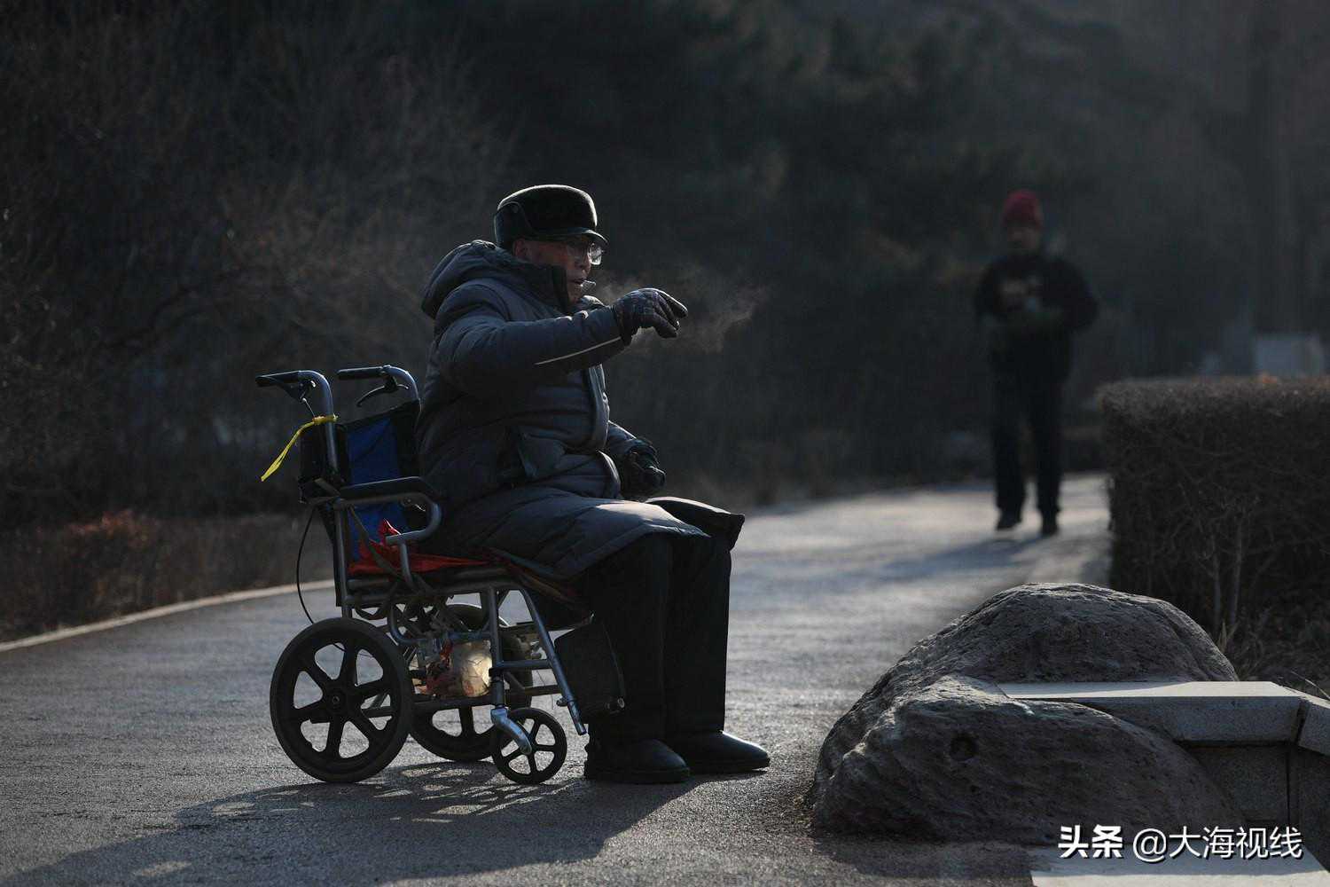 2020年12月28日,中山公园内,一位迟暮老者坐在轮椅上,借着一旁舞蹈者的音乐挥动手臂,锻炼身体。