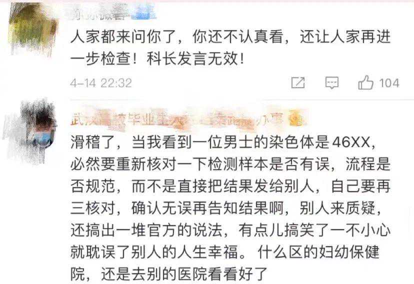 这对沈先生来说简直是晴天霹雳…就在他悲伤的无法自拔时,婚检中心说报告错了。4月9日又出具了新的检验报告,重新将沈先生的染色体诊断结果更正为46XY。沈先生说自己情绪已经低落了一个星期,几乎没有睡过一个安稳觉,不知道该如何面对妻子。幸好,这最终被证实是乌龙一场。
