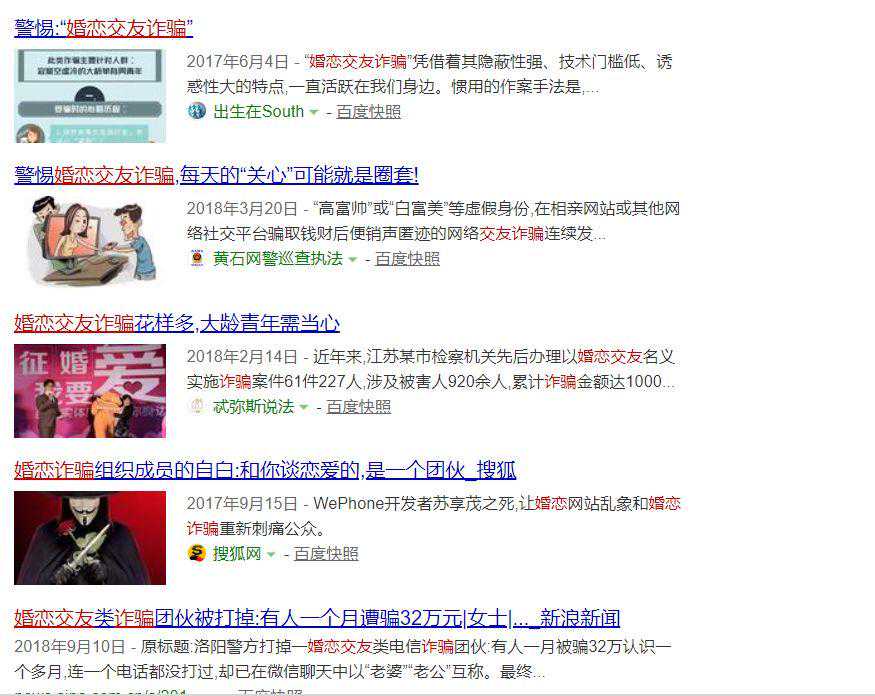 网络搜索“婚恋”、“诈骗”结果