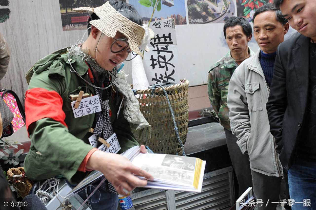 重庆这位小哥的征婚方式有些奇特。2011年3月2日,在市中心解放碑,小哥头戴一顶剪成风车的破草帽(据他说是明星所赠与),穿着绿色破烂薄衣,蓝色裤子的裤角一长一短,不仅打着领带,手臂上还戴着红袖章等自认为时髦的自制挂牌,鼻子上则托着粗铁丝制成的空框眼镜。他的怪异征婚方式惹来众人的围观。(图片来自东方IC)