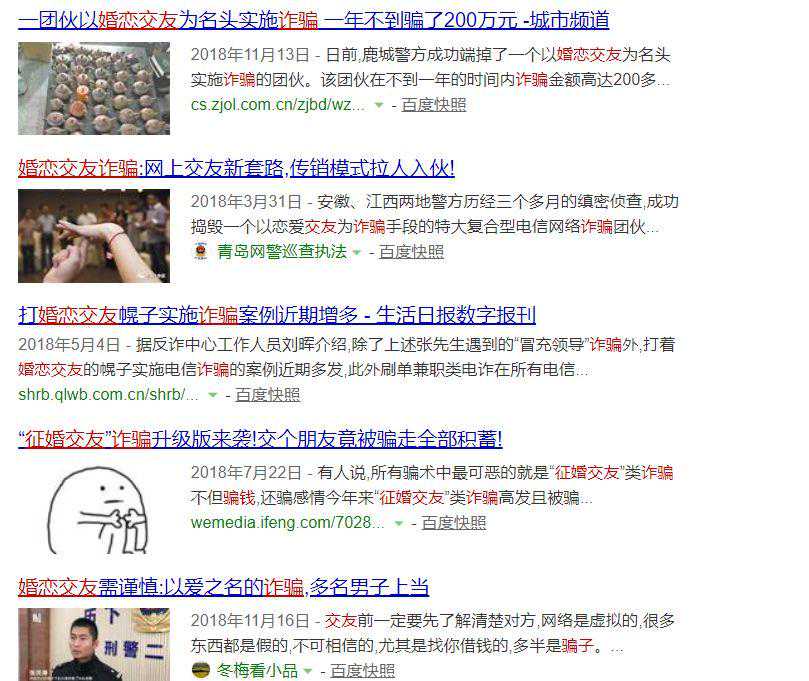 网络搜索“婚恋”、“诈骗”结果