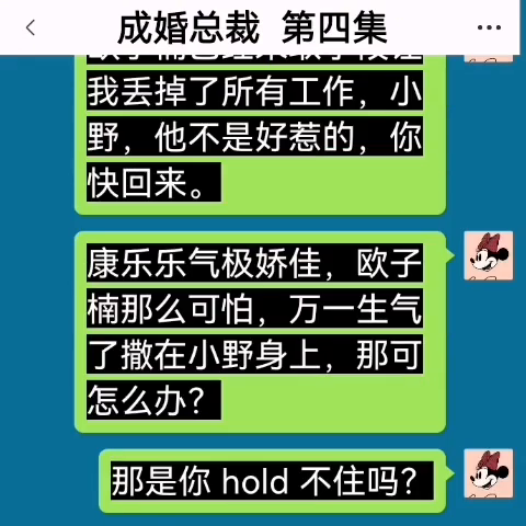 康小野撇撇嘴,不要,我有我的计划,你不要打扰我。欧子楠已经采取手段让我丢掉了所有工作,小野,他不是好惹的,你快回来。康乐乐气极娇佳,欧子楠那么可怕,万一生气了撒在小野身上,那可怎么办?那是你hold不住吗?我当然不会啦,银行卡里的存款还够你花一阵子的,你就先不要工作啦,如果做饭难吃,就去外面吃,等我玩够了就回来。好了,就这样拜拜。