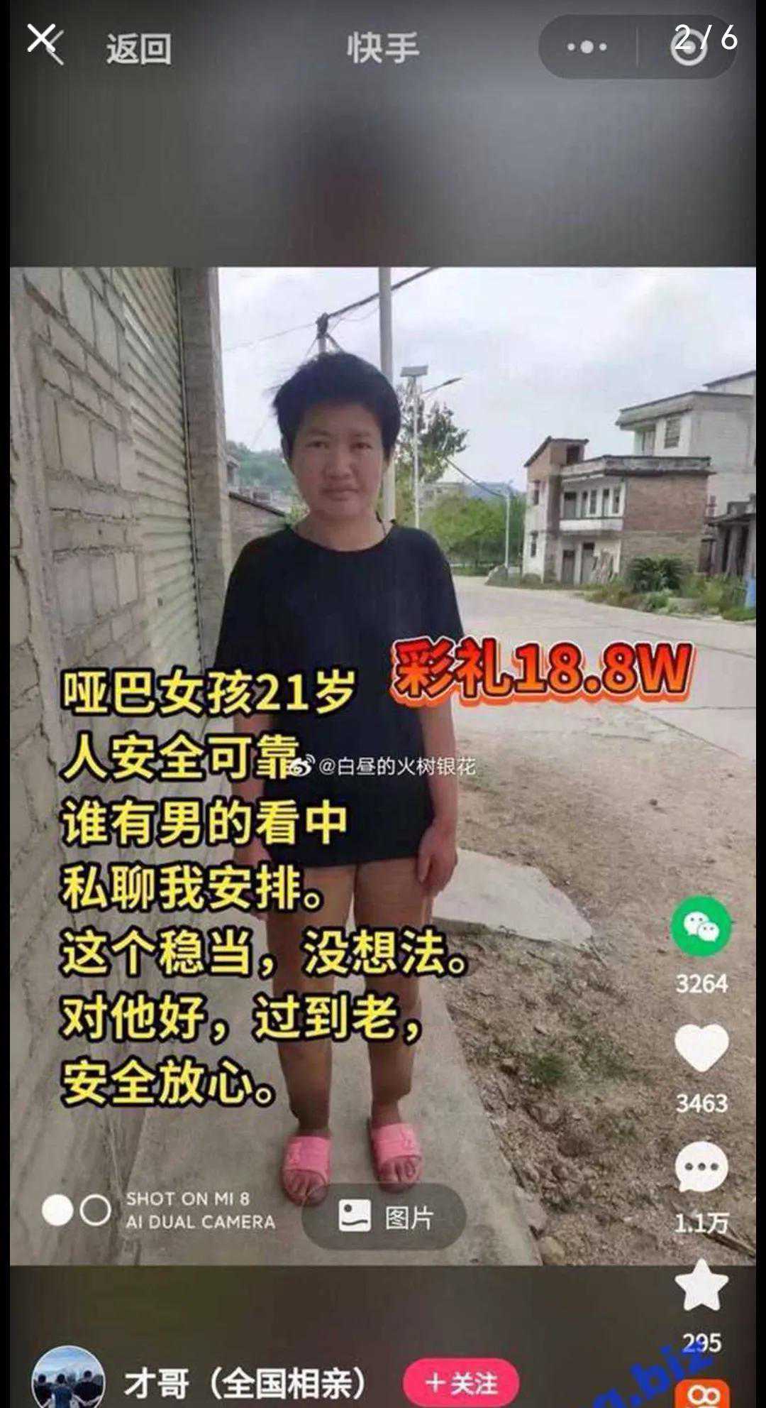 「农村女孩21岁,八成智商,听话,能踏实过日子」,一名拥有10多万粉丝、名叫「才哥(全国相亲)」的网红主播,在内地短片平台快手发布多则征婚信息,声称为多名女子于网上征婚,但怀疑她们多数有智力障碍或身体残疾问题,在这些片段内更标明礼金价目,一般由10至20万元(人民币)不等。