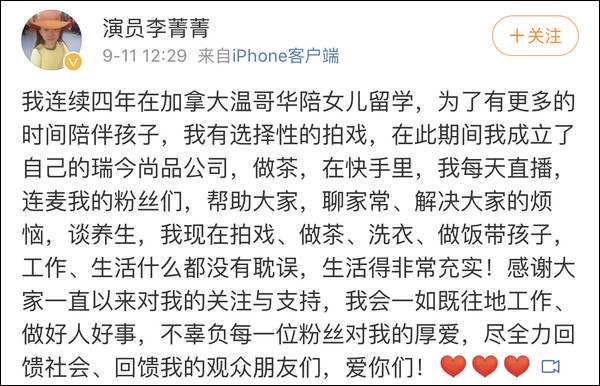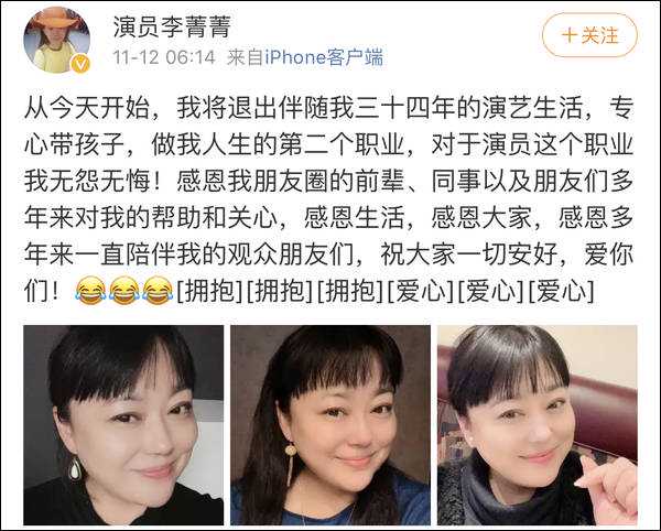 11月12日,李菁菁忽然在微博宣传退出演艺圈,选择回归家庭做好自己人生的第二个职业“妈妈”,回首过往对演员这个职业无怨无悔。