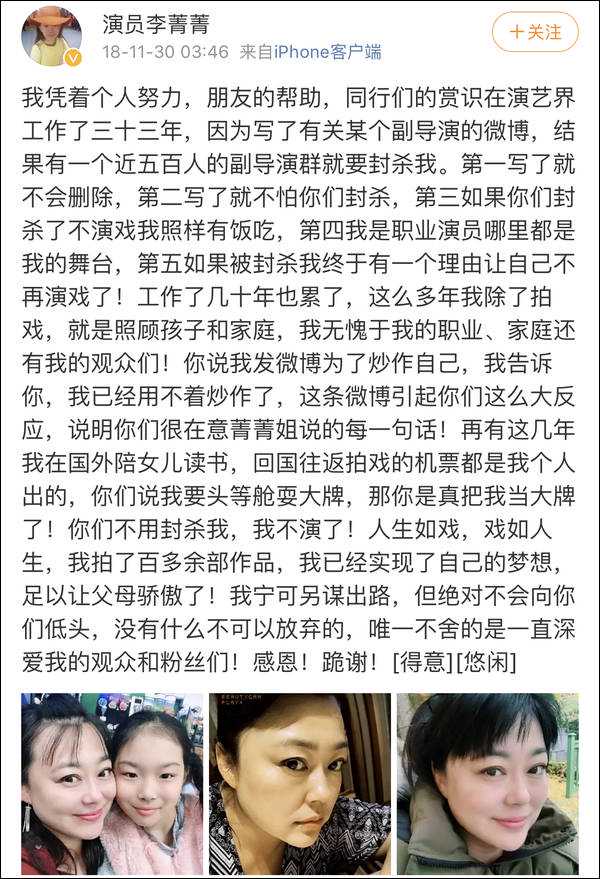 但由于曝光此事,去年11月李菁菁表示自己遭到一个近500人的副导演群封杀。不过她并不因此屈服,称自己宁愿另寻出路,也绝不向其低头。对演艺圈不良风气坚决说不的态度获得不少网友的支持鼓励。