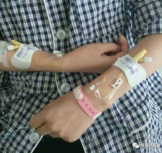 吴婷展示自己插满留置针的手臂