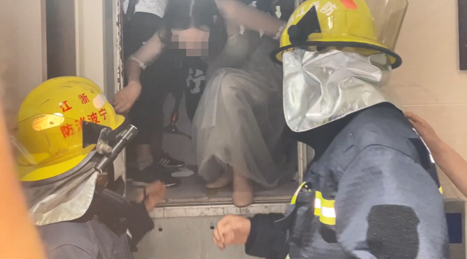 据现场人员告诉消防员,被困在电梯里的是一对新人以及伴郎伴娘、摄影师等,共计14人。由于轿厢里空间有限,加上天气比较闷热,被困人员被困时间较长后直呼“受不了”,心慌意乱地等待着救援。