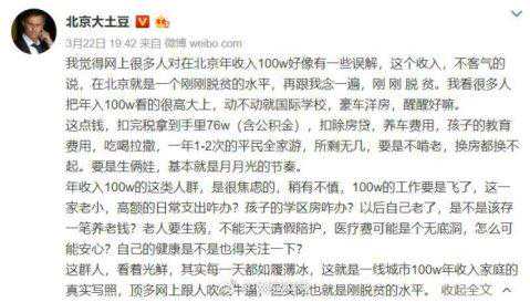 其实还有一个悲剧,就是别人人生的起点,你可能一辈子都不能达到。最近,有一网友算了一笔账,在北京,年收入一百万,就是“刚刚脱贫的水平”。100万元,“扣完税拿到手里76w(含公积金),扣除房贷,养车费用,孩子的教育费用,吃喝拉撒,一年1-2次的平民全家游,所剩无几,要是不啃老,换房都换不起。要是生俩娃,基本就是月月光的节奏。