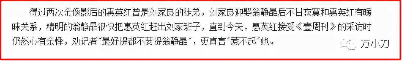 翁静晶知道后,很快把惠英红赶出刘家班子。过了许久,惠英红接受《壹周刊》采访时仍然心有余悸,劝记者不要提翁静晶,实在惹不起。