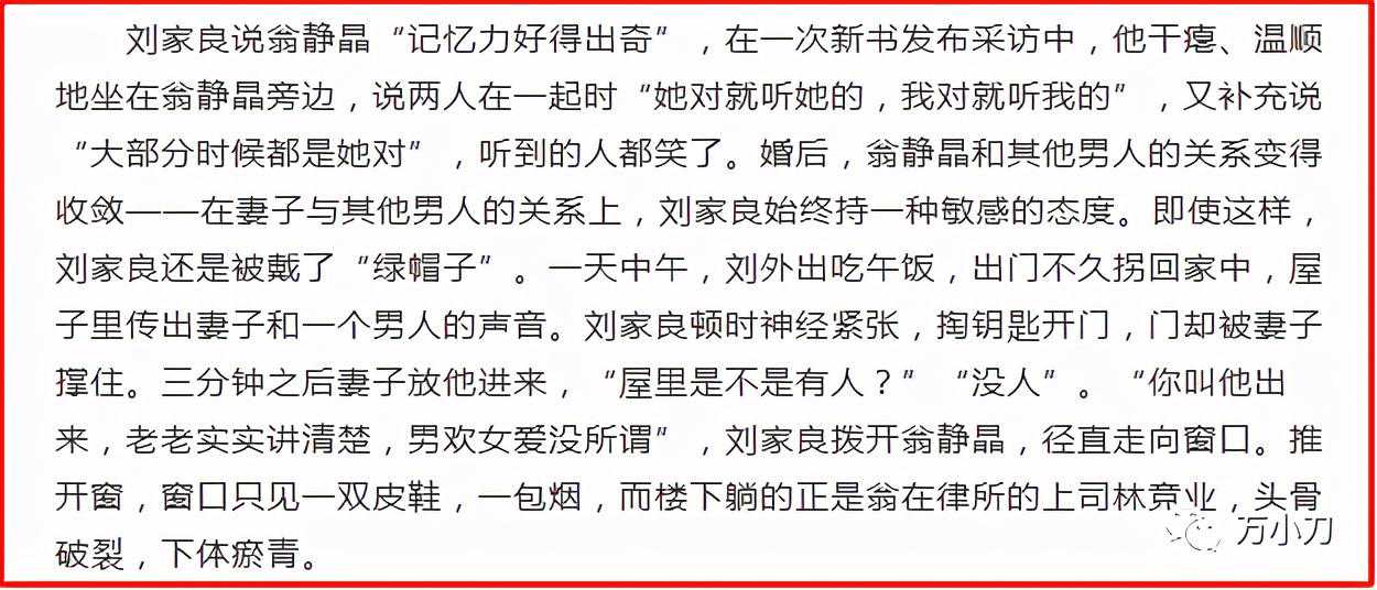 刘家良顿时神经绷起,掏钥匙开门,门却被翁静晶抵住,过了几分钟才放他进去。刘家良进屋后,厉声问翁静晶:“屋里是不是有人?”翁不承认。