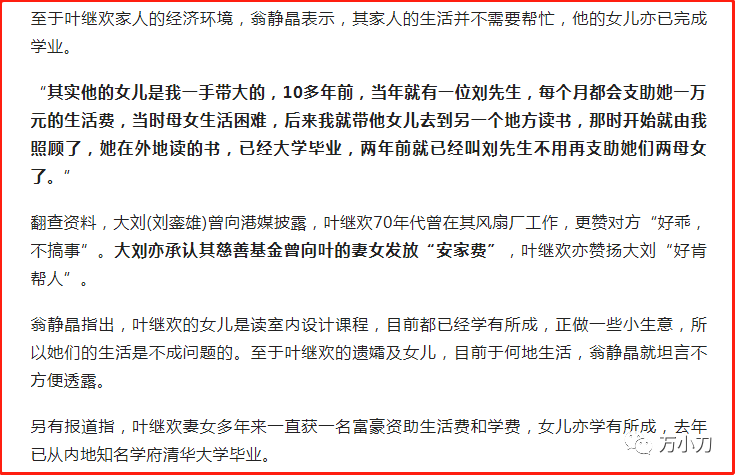 后来,叶继欢以前打工时的老板——香港风流富豪刘銮雄,也每月资助1万元给叶继欢的女儿读书。在两人的共同关照下,叶继欢的女儿最终考入了名校。