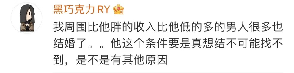 有网友表示,劝一劝有些男人,不要眼光太高,不要太挑。别觉得自己读那么多书,赚几个钱就可以心高气傲挑三拣四了。别嫌弃七大姑八大姨给你介绍的相亲对象,那就是你能配得上的标准,别幻想着发帖找个更好的,太不脚踏实地了。