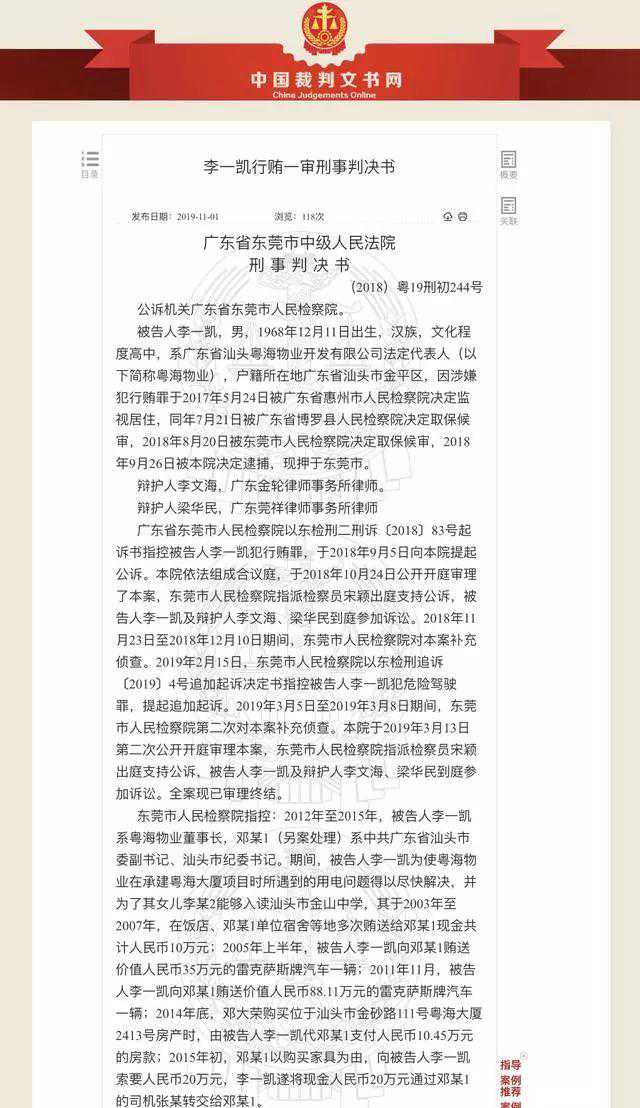 李一凯正是给邓大荣两次送车、送购房优惠的这名富商。判决书里有这样的形容:李一凯对曾任汕头市委副书记的邓大荣,有长达10余年的“情感投资”。