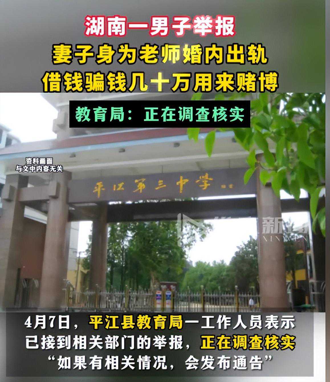 据这名发帖网友称,他的妻子在平江县第三中学任心理科教师,却犯下了多项原则性错误,包括婚内出轨、借钱、骗钱去DB。