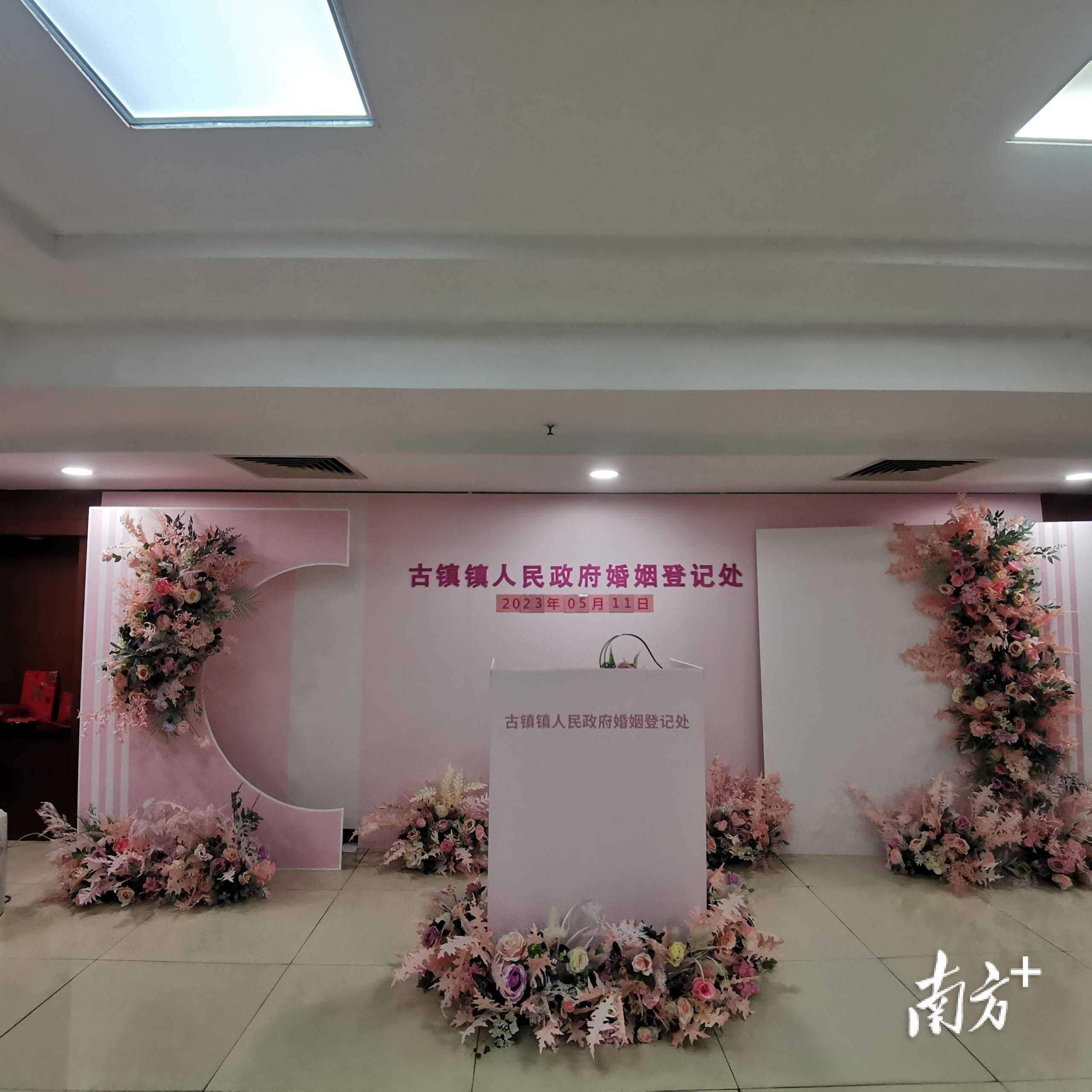 中山市婚姻登记中心以“圆圆满满、花开浪漫”为主题,以仪式感、氛围感、艺术美感为标准,对三楼颁证厅进行升级改造。