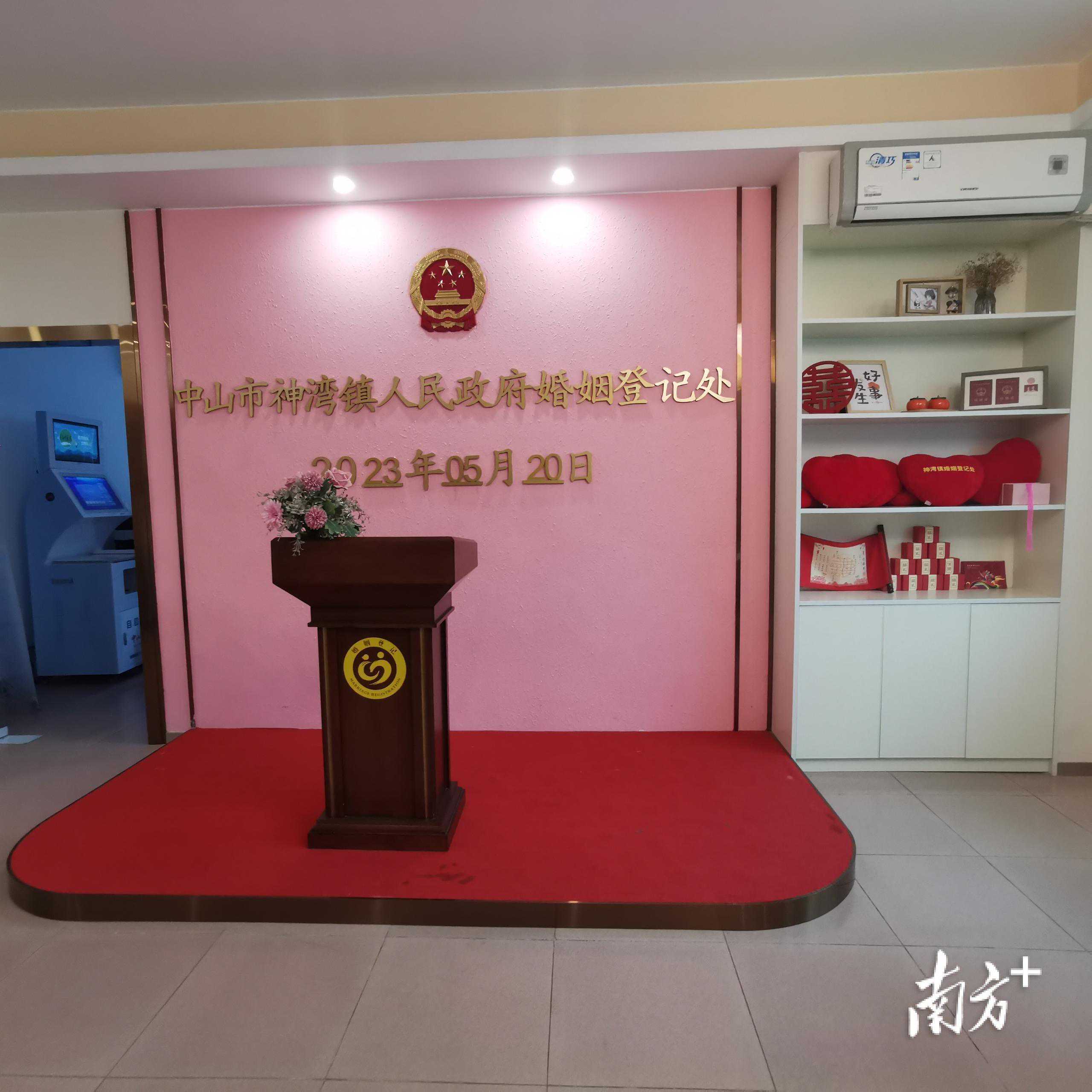 神湾镇婚姻登记处于2022年5月搬迁至镇行政服务中心内,婚姻登记处按照规范化建设要求,新的婚姻登记处增设独立办证窗口,内设办公室、档案室、宣誓区、图书角等,还配有候登区,当事人可以在等候的同时观看大屏幕播放的宣传片。颁证厅体现了浪漫与喜庆。庄严的国徽、精美的吊灯和专业的典礼台为每桩婚姻增添了幸福和神圣的元素。新人领取结婚证书后可以在婚姻登记员的见证下合影留念,留住这最美好的时刻。