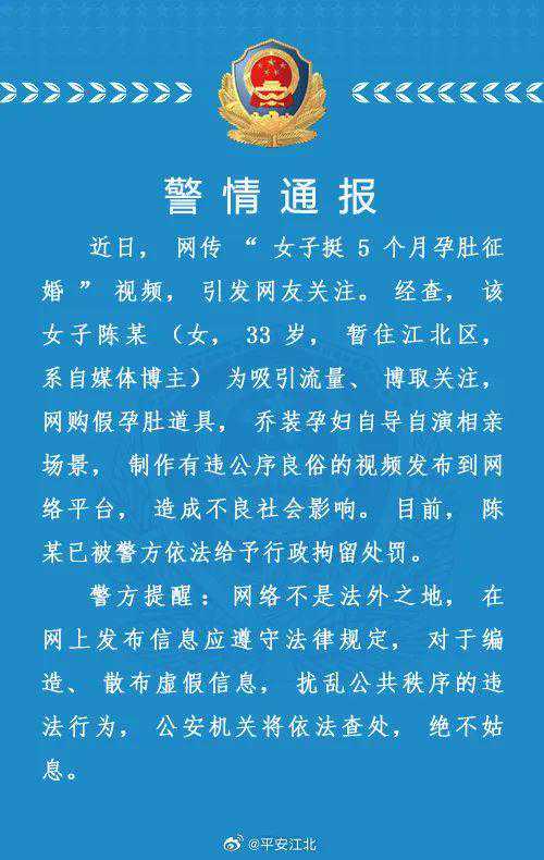 1月11日,“@平安江北”发布警情通报称,陈某已被警方依法给予行政拘留处罚。
