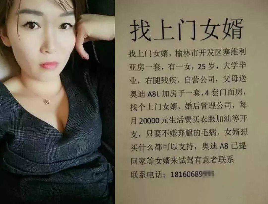 近日,一则征婚广告在榆林人的朋友圈疯传。“找上门女婿,榆林市经济开发区塞维利亚房一套,有一女,25岁,大学毕业,右腿残疾,自营公司,父母送奥迪A8L加房子一套,4套门面房,找个上门女婿,婚后管理公司,每月20000元生活费买衣服加油等开支,只要不嫌弃腿的毛病,女婿想买什么都可以支持,奥迪A8已提回家等女婿来试驾,有意者联系。”