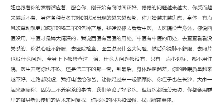 骆丽之后每天都在狂热地在餐桌上讲二不姜寒茶的理论,还做了产品代理花了十多万。