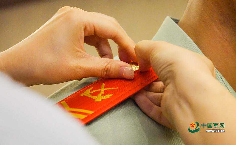 游戏环节中女嘉宾认真地给男嘉宾戴身上的肩章。
