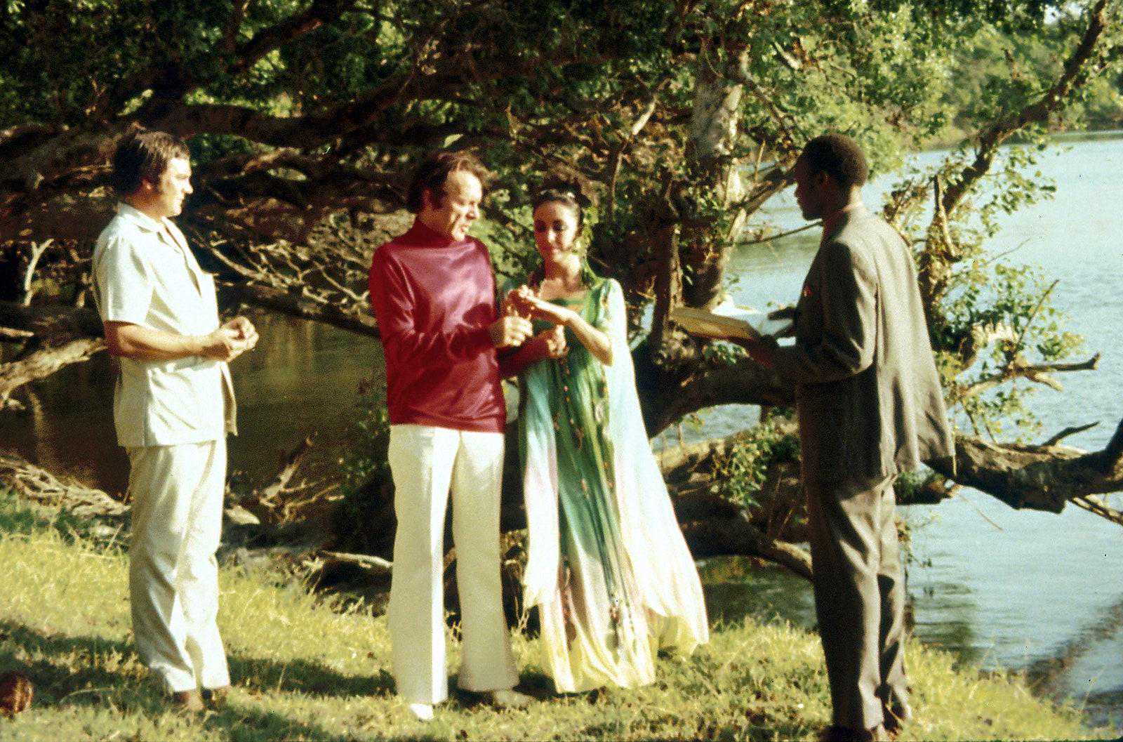 1975年,泰勒和伯顿在博茨瓦纳举行了第二次婚礼。这一次,伊丽莎白穿着英国设计师吉娜·弗拉蒂尼(GinaFratini)设计的ombré裙子,将头发盘在头顶,用羽毛装饰。它在2011年的拍卖会上以6.25万美元(47000英镑)的价格售出。