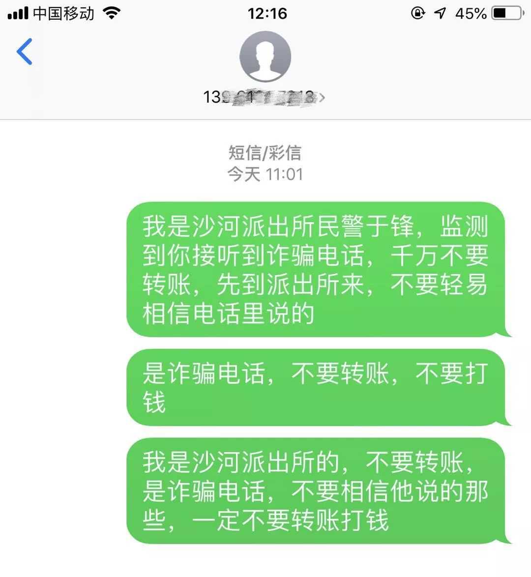 “就在我准备骑车去银行的时候,我看到了于警官给我发的信息,我一开始也不敢确定,但是于警官他一直发短信坚持打我电话,我这才开始怀疑自己可能上当了。”文女士说道。