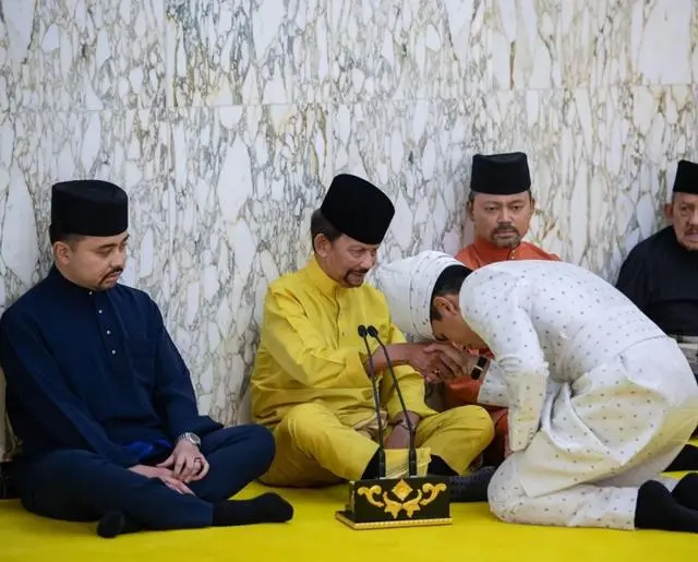 接下来的1月11日也是一个重大的日子。马丁王子身穿银线点缀的白色传统服饰,驾驶着黑色劳斯莱斯抵达首都斯里巴加湾市的奥马尔阿里赛义夫丁苏丹清真寺。在那里,他向77岁的文莱苏丹父亲行跪拜礼,并亲吻了父亲的手。按照宗教习俗,当日的仪式仅限男性亲友参加,因此新娘并未现身。