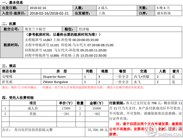 我购入的就是张大妈上出现好多次的下面这个套餐,总体下来还是不错,因为是正春节,价格几乎翻倍,平常的话,这个套餐的价格在10000/人的样子。