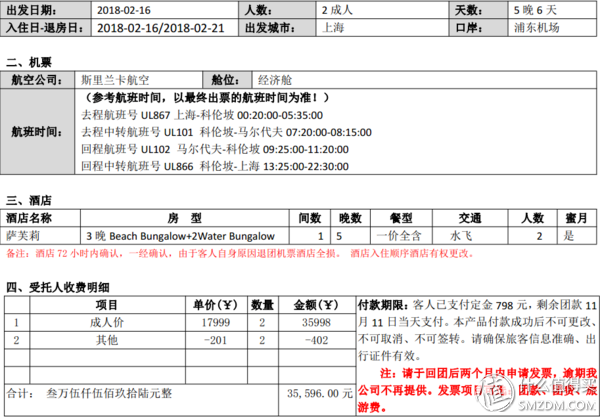 (这中间还有一个插曲,2月份的时候,马尔代夫由于政治原因,发生了集结游行,中国政府也发了旅游警告。好多人都在犹豫要不要退单,我联系问了一下,我们这个最多可以退2500一个人,航班是斯里兰卡航空的,酒店是马尔代夫的,完全不管中国政府的警告。最后,还是决定去了,很大的一个原因的是我们不去居民岛屿,直接从机场岛坐水上飞机到度假岛了,游行什么的在居民岛。那段时间特别害怕同事问我过年在哪里,我已经被喷N次,发了警告还要去,就差微博上,张大妈上那种疯狂骂人了)