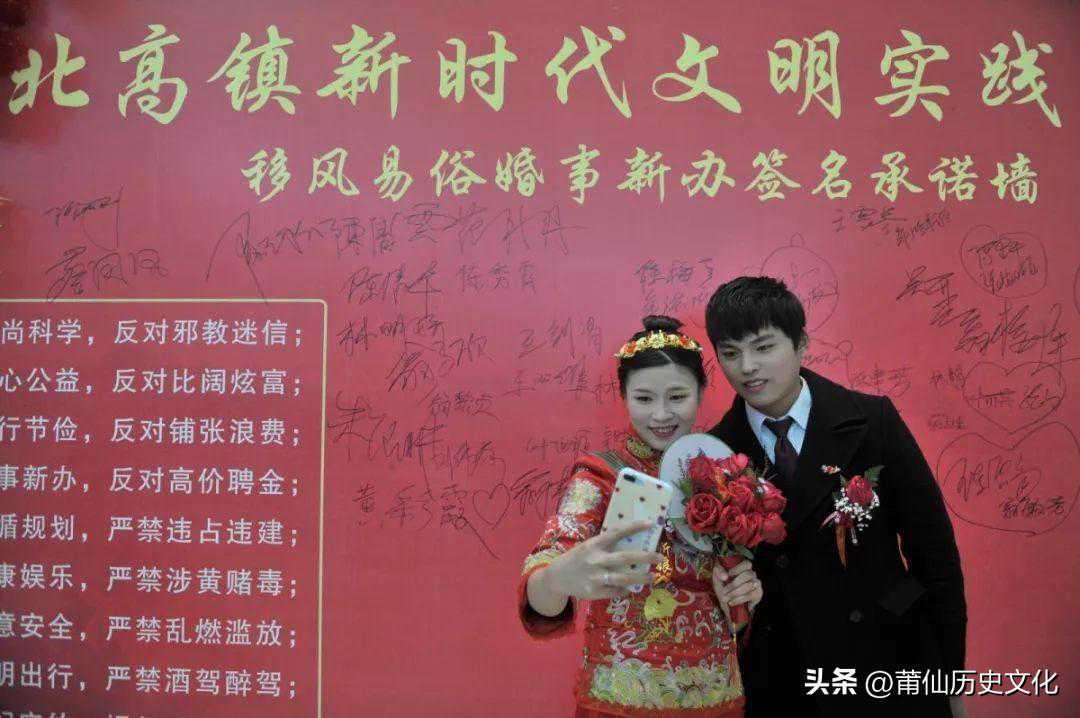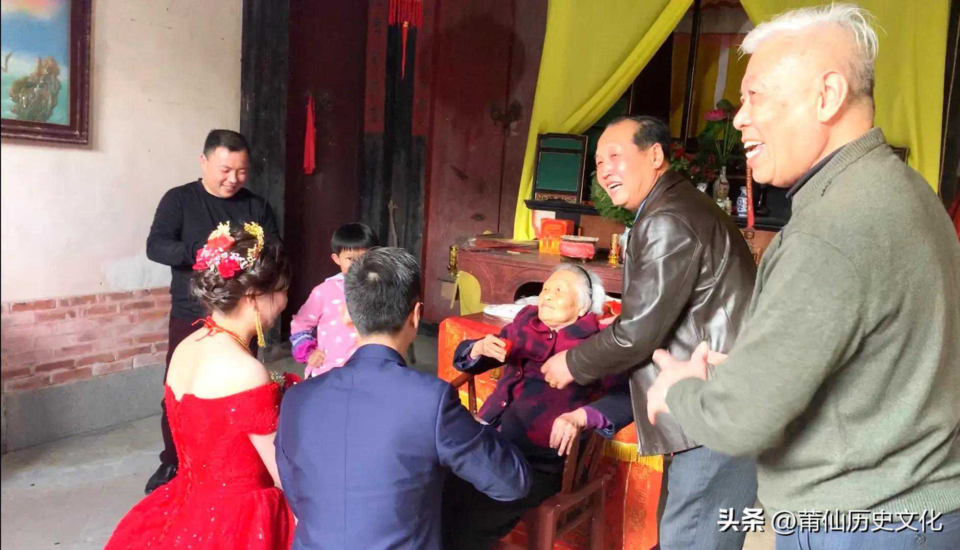 莆田旧时结婚许多最典型最有趣的仪礼都还保留着,如“择吉”、“上头”、“拜堂”、“办酒”、“掩门”等。如今新娘抬花轿变成坐缀满鲜花绸带的铝亮小轿车。婚礼上,只有伴娘和牵着婚纱的“金童玉女”,没有所谓“奶嫂”了;洞房中“送房兄”做经文的赞句也加进一些新词语,如“一对红心向四化,两双巧手绘新图”啦,“喜看两人成佳偶,优生一个树新风”啦,等等。以下是仙游龙坂村民间结婚赞句: