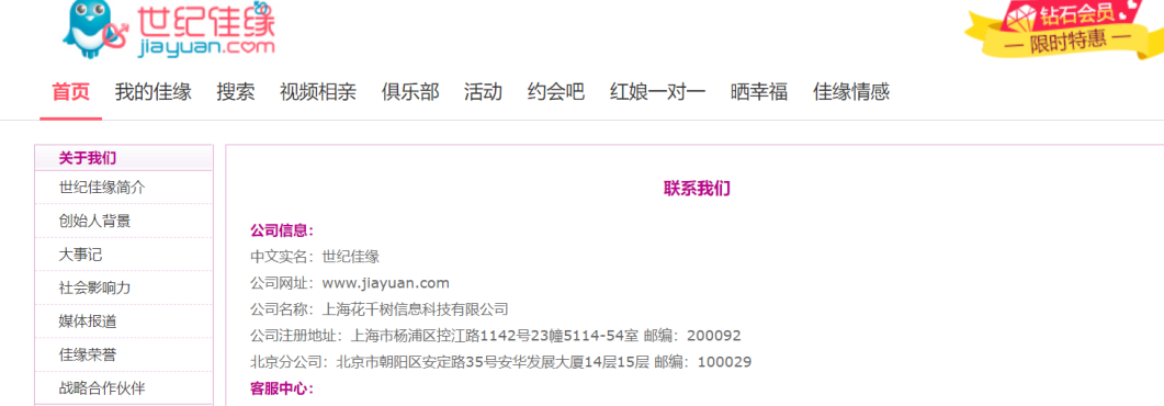 世纪佳缘官网显示,公司名称为上海花千树信息科技有限公司(以下简称“花千树科技”),注册地址在上海。7月19日下午,《每日经济新闻》驻上海记者来到世纪佳缘位于上海的办公场所,但员工又称公司总部在北京。