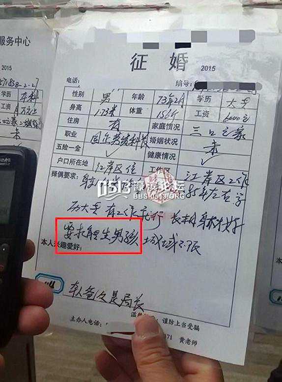 今日,市民严先生在逛解放公园时,征婚角的一条征婚启事引起他的注意,发布征婚启事的男子要求未来妻子“能生男孩”,他觉得这个人很。今日下午,记者来到解放公园内的征婚角,悬挂着上百张征婚启事,有很多市民或是帮子女,或是帮朋友找寻合适的对象。记者找到了严先生觉得很奇葩的征婚启事,在启事择偶要求一栏,征婚者胡先生要求女方“能生男孩”。并且,在启事的最后,胡先生还说明“本人爸爸是局长”。(2016-04-10中国新闻网)