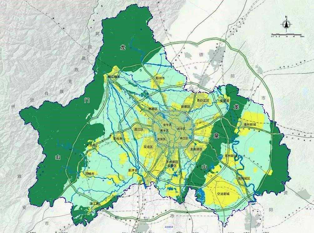 为了实现这一目标,成都得留住人、财、技,而留住人、财、技,成都就必须要拓展,所以,在新总规中,就是变沿袭千年的“两山夹一城”为“一山连两翼”,以低矮且具有旅游价值的龙泉山串联起新的成都城市空间,引导产业向山东侧转移。
