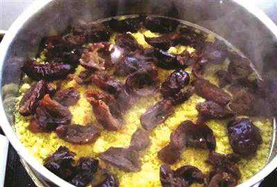 枣介糕的做法虽然不算复杂,但很有技术含量,需要有经验的大厨“挑大梁”。挑选饱满的大枣,去掉枣核,在开水中煮,煮到满屋子飘着枣香,锅里基本没有水时就可以关火了。这时枣里的甜味已全部被煮了出来。取黄米面适量,在面粉堆里挖个坑,放上水,过几个小时,面就会把水全部吸收,这时用两手揉搓面粉,让面和水充分融合。抓一把掺水的黄米面,使劲一攥,攥成一团,然后用手指轻轻一搓,面团就散开了,这时的面就可以上锅了。面和水的比例较难把握,枣糕要好吃,最关键的是和面这一步。锅里的水开了,把掺好水的面均匀地洒在蒸笼底层,等待白黄色的面慢慢变成嫩黄色,这时均匀地摆上一层枣,然后洒第二层面,再摆第二层枣,以此类推。等到最后一层枣摆好后,下边的面也就全部熟透了。