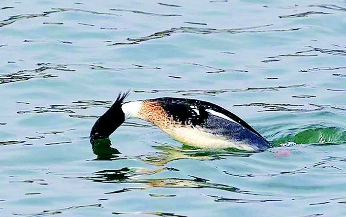 谷国强表示,当天风很大,海湾中结了大片的冰,但红胸秋沙鸭们仍在捕鱼,它们一会儿浮出水面,一会儿又潜入海底。这个时节的红胸秋沙鸭开始换装繁殖羽,羽毛颜色比深秋刚抵达时亮丽许多,其中雄鸟头颈黑白分明,雌鸟头颈呈褐红色。