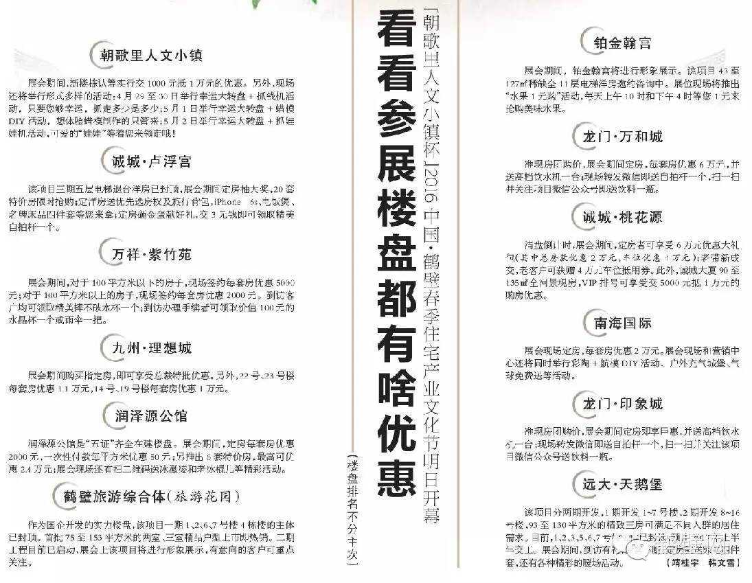 本届住宅产业文化节汇集朝歌里人文小镇、诚城·卢浮宫、润泽源公馆、南海国际、远大·天鹅堡、鹤壁旅游综合体(旅游花园)、铂金翰宫、万祥·紫竹苑、九州·理想城、龙门·万和城、龙门·印象城、诚城·桃花源等十多个精品楼盘。与往届住宅产业文化节相比,本届展会房源业态十分丰富,几乎涵盖了目前鹤城楼市的所有楼盘形态,包括刚需住宅大盘、改善型楼盘、花园洋房、城市综合体、文化旅游度假项目、小区商铺等。可以说,有购房意向的人,都能在本届展会上找到自己想要的房子。