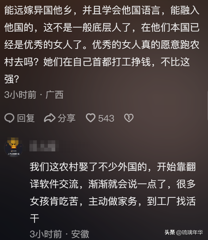 对于那些有钱的人来说,国际婚姻其实很正常,这个没什么好质疑的,但是对于好多在农村的大龄青年,他们觉得可能外籍新娘,结婚成本要低一点吧