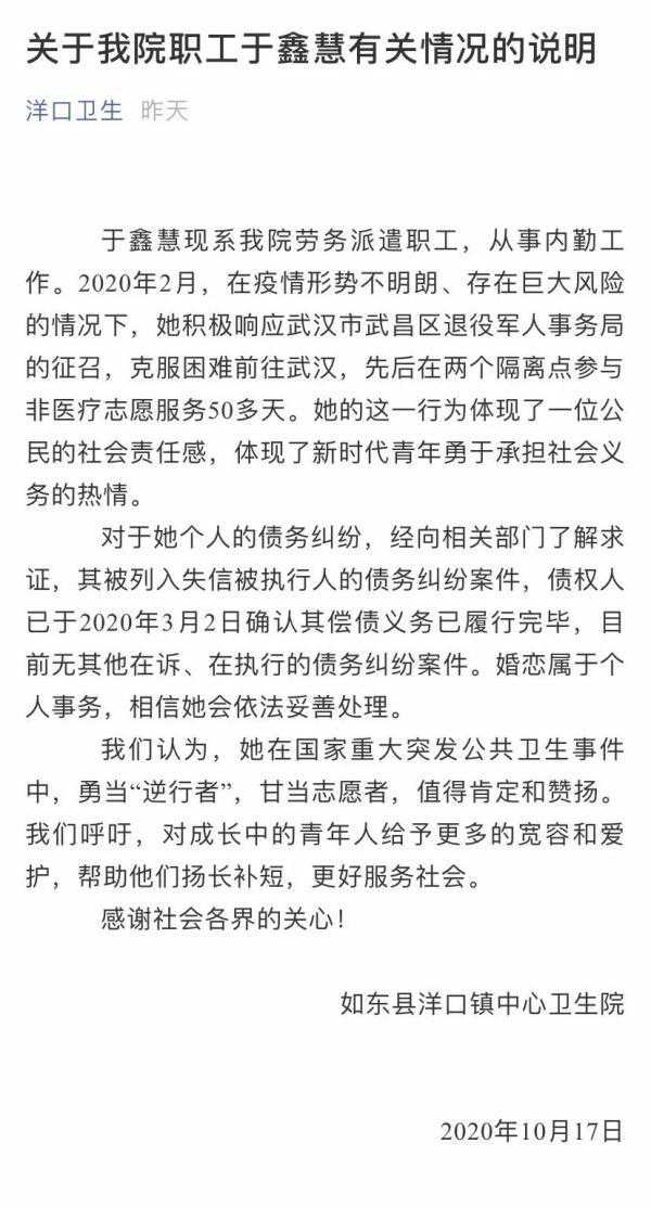 针对外界质疑的于鑫慧卷入的个人债务纠纷问题,如东县洋口镇中心卫生院表示,经向相关部门了解求证,其被列入失信被执行人的债务纠纷案件,债权人已于2020年3月2日确认于的偿债义务已履行完毕,目前无其他在诉、在执行的债务纠纷案件。“婚恋属于个人事务,相信她会依法妥善处理。”