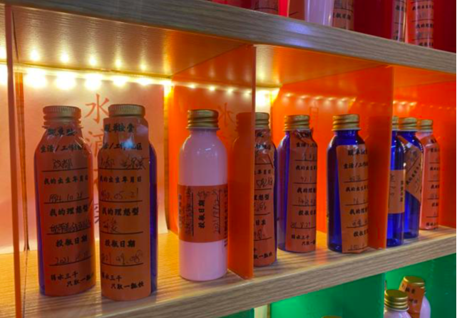 顾客们可以在“缘分墙”上挑选“缘分瓶”,蓝瓶代表小哥哥,白瓶代表小姐姐,灰瓶代表高富帅、金瓶代表白富美,顾客根据瓶中的个人信息、声音、照片等资料决定是否想要认识,也可以投入写有自己资料的“缘分瓶”等待有缘人取走。