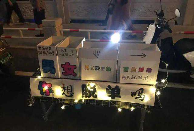 记者看到,有人在商业广场摆“脱单盲盒”摊位,吸引不少人围观。摊点设置得很简单:几个纸箱,纸箱上分别贴着“男”“女”字样的纸条。同时,摊主还摆上了“1元拿1个”“1元留1个”“网络一线牵,珍惜这段缘”等广告标语。