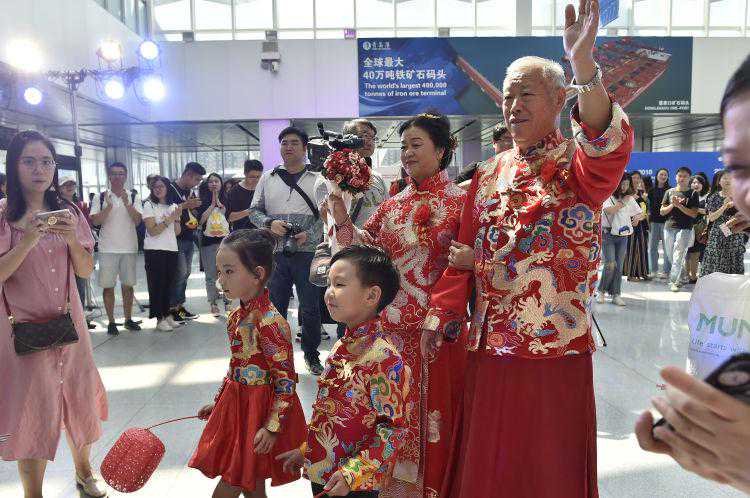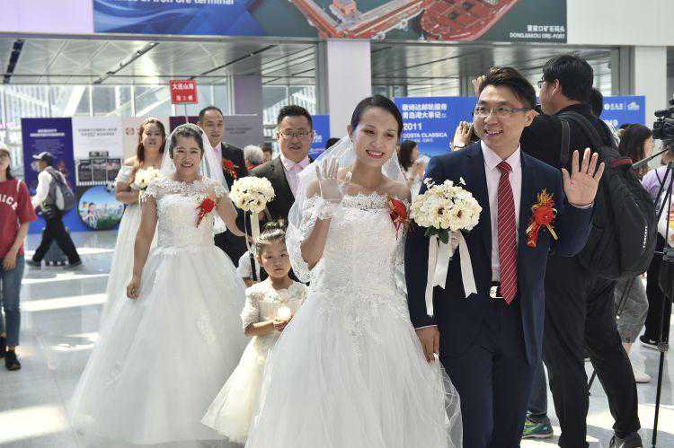 当天上午11时许,婚礼仪式正式开始,《婚礼进行曲》的悠扬旋律响起,在音乐声中,10对新人在小花童的引导下,缓缓走入典礼现场。洁白的婚纱、喜庆的唐装、优美的音乐、时尚的布置,整个邮轮母港被甜甜的幸福所萦绕。