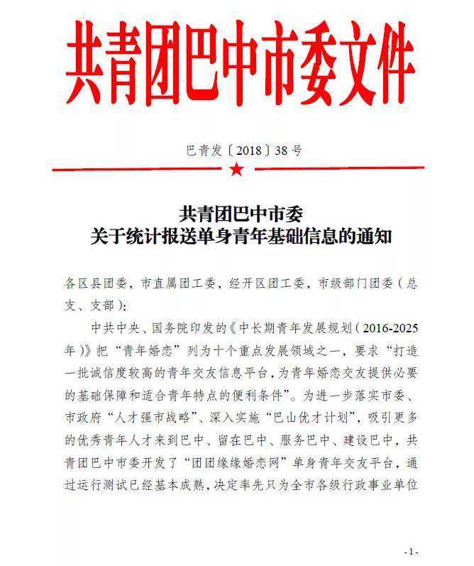 目前我们已向全市889个单位发送了《关于统计报送单身青年基础信息的通知》(巴青发〔2018〕38号)文件,按文件要求和统计范围报送单身信息就可以啦!当然,你还可以来电或留言了解具体加入方式。
