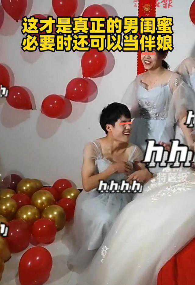 据网友爆料,当伴娘的这个男闺蜜是新娘的高中同学,两个人平时形影不离,关系非常好,得知新娘要结婚的消息时,男闺蜜表示自己必须要来当伴娘。