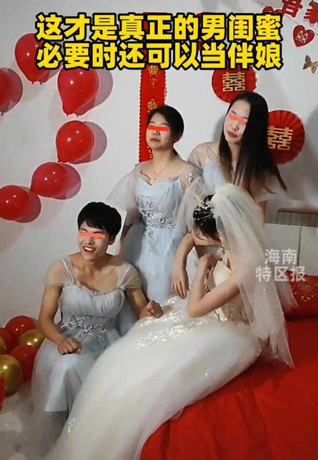 海南的一对新人婚礼当天,新娘把自己的男闺蜜请到了现场,让男闺蜜给自己当伴娘,她表示男闺蜜给自己承诺过一定会送自己出嫁,如今他兑现承诺的时候到了。