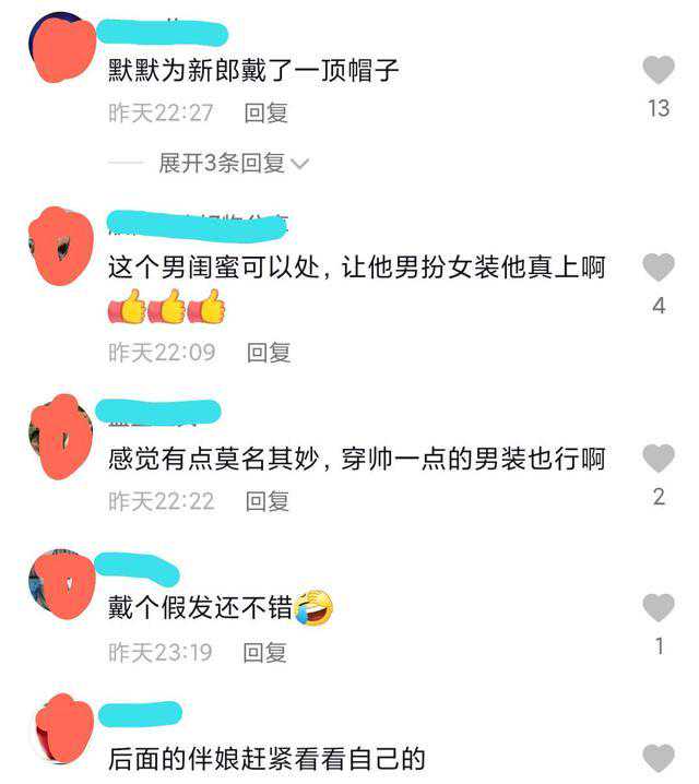 也有网友说,我表示很无语,男闺蜜参加朋友的婚礼没有问题,不过他完全可以穿一身帅气的西装去当伴郎,他非把自己整成这样,还跟新娘拉拉扯扯,确实有些过分了,我一个女人看了都不舒服,真不知道新郎是啥感受。