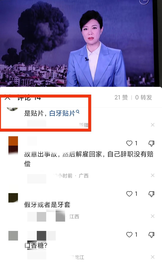 有一些网友说,这个牙并不是牙齿,而是牙齿贴片,不过不管是牙齿还是贴片,普通人在遇到这种情况都会很尴尬,更别说是站在全国观众面前的主持人了。