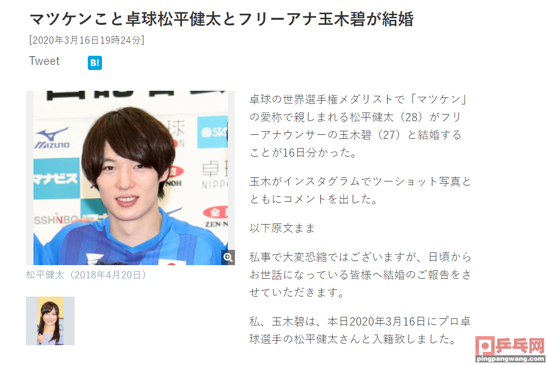 据日本媒体的报道,乒乓球世界锦标赛奖牌获得者、昵称为“松健”的松平健太(28岁),与自由主播玉木碧(27岁)结婚。