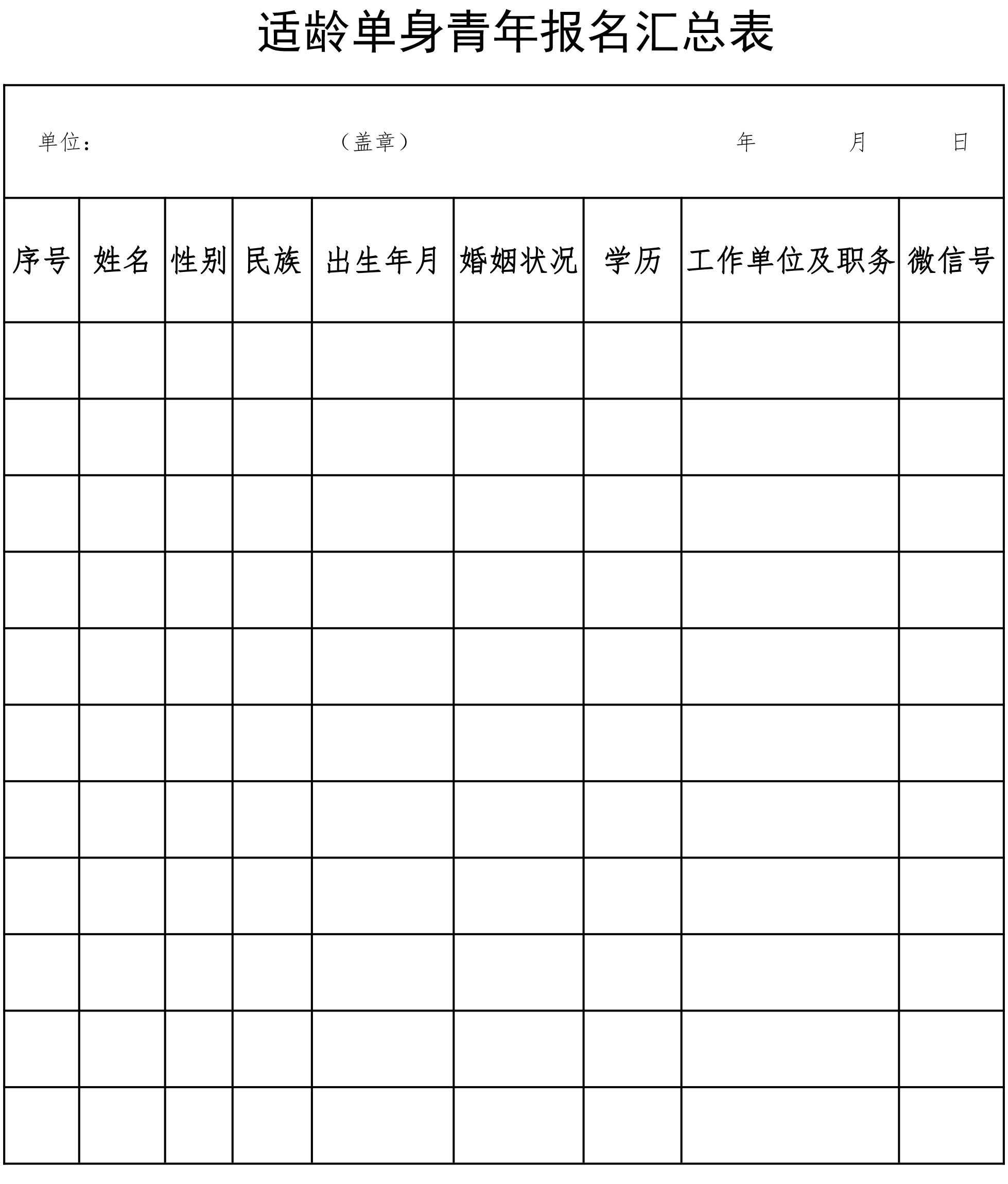 各单位团组织、市青联各界别要组织适龄单身青年踊跃报名,做好审核、报送《适龄单身青年报名登记表》和《适龄单身青年报名汇总表》工作,于8月5日前将报名登记表和汇总表一式三份(电子和纸质版)报团市委组织部。信息填写要求真实、准确。