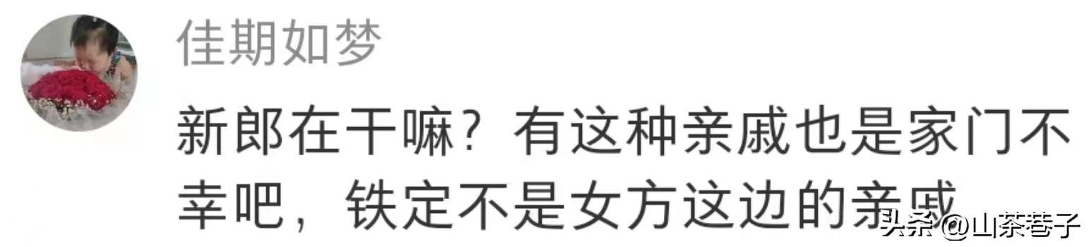 还有网友说:这种习俗就是给新媳妇下马威的,测试你被欺负的反应,如果默默接受了,以后男方亲戚就知道你是软柿子好拿捏,如果当场不依不饶,他们就会说你是泼妇,试图道德打压你,所以就看你是要名声还是实惠。