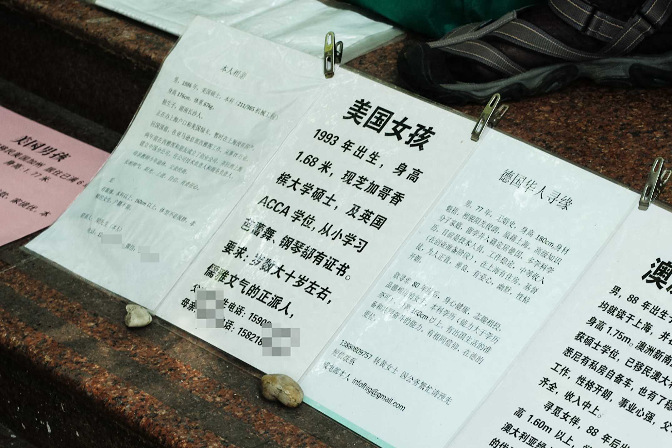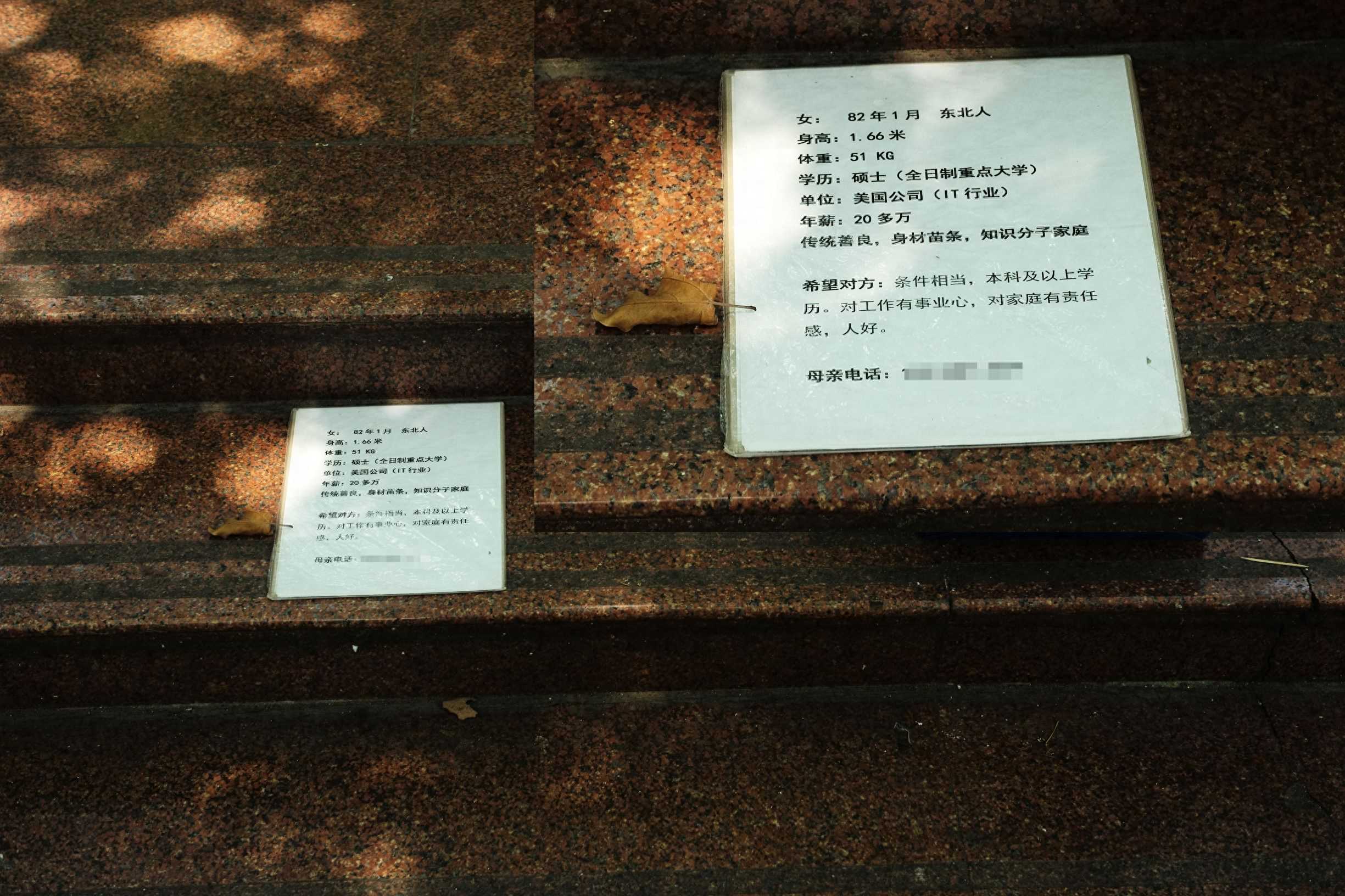 相亲角征婚的人实在太多了,一名非沪籍外地女孩的征婚信息只能扔到少人问津的台阶上。